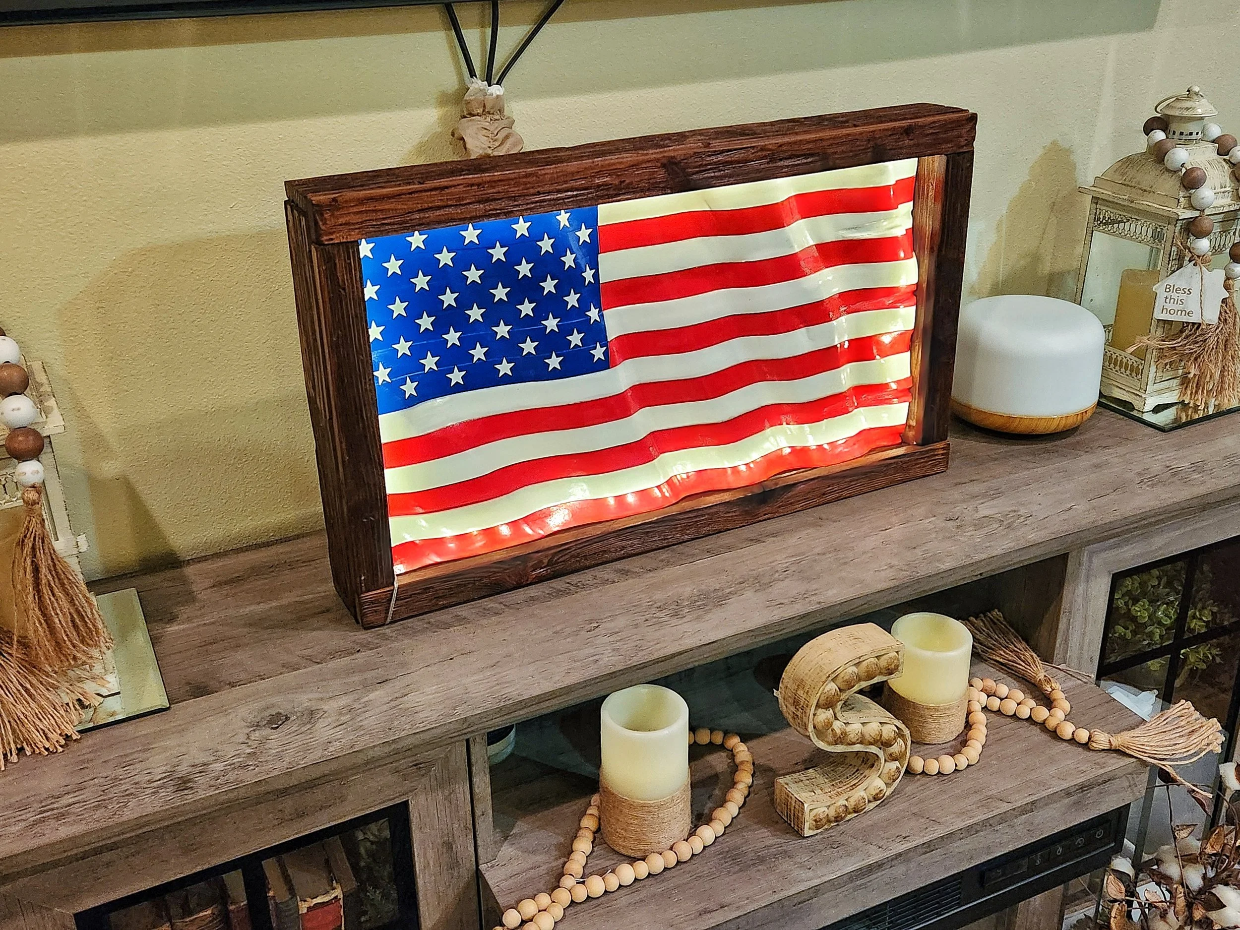 Carved from pine boards and then glue pressed together, this makes a beautiful and patriotic display for your home, office, or camp. Flags can be made most any size, but the ones pictured are 14” tall x 25” long x 3 inches thick with distressed cedar frame. You can get an open frame to set battery powered candles on, or a lipped frame to hide LED strip lights behind it. (lighting not included) You can get the flag distressed (to look worn and dirty) or crisp and clean. Up to you. Custom flag orders and sizes are welcome!
